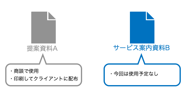 例えば、印刷してクライアントとの商談で使用する【提案資料A】と、今回の商談では使用する予定がない【サービス案内資料B】がクラウド型ファイルサーバー上に保管されていたとします。