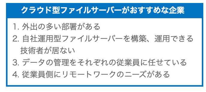 - 自社運用のファイルサーバーとクラウド型のファイルサーバーのどちらを導入するか迷っている