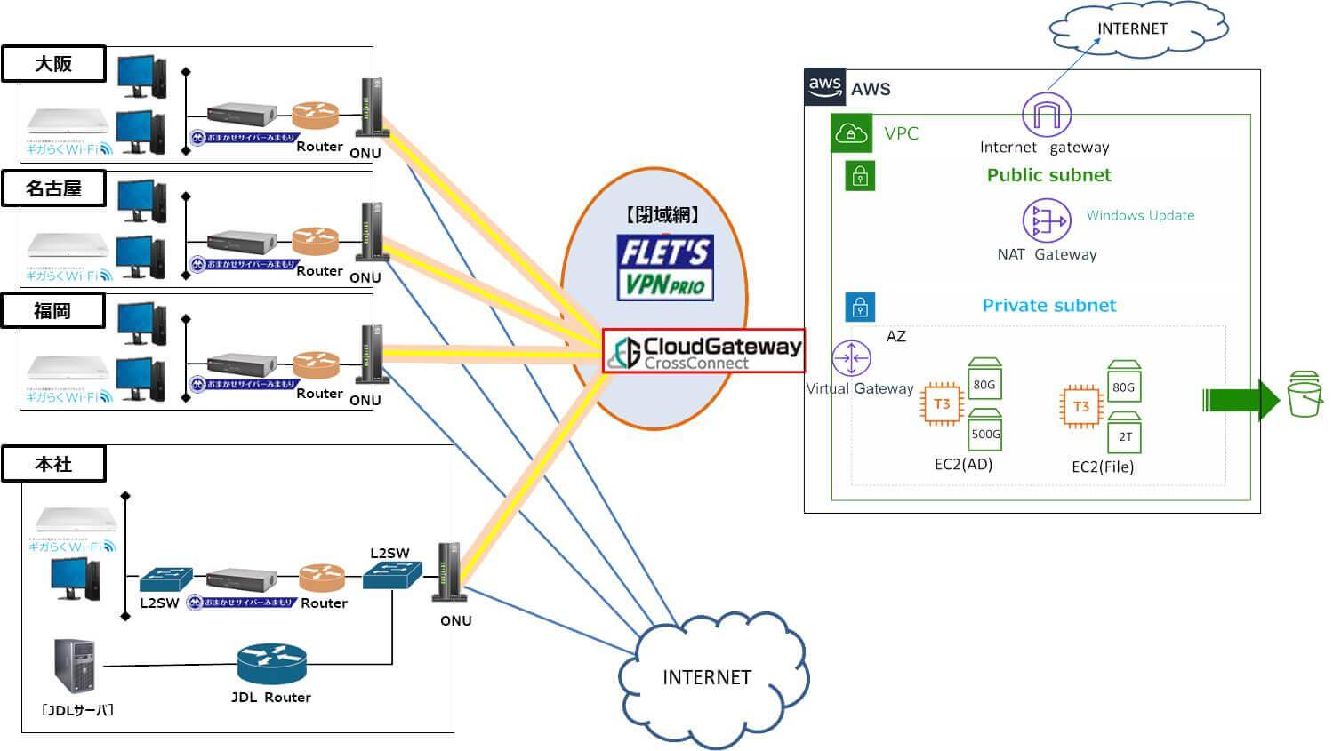 【ご要望・課題】 オンプレミスサーバーをメイン活用、Microsoft Azure上のサーバーをバックアップとして利用する中で下記のような課題があった。 ◆システムの故障発生から復旧までに時間がかかり、業務に支障が出ることがあった また運用においては、専任の情報システム担当者を配置していないため、稼働負担を可能な限り低減したい。 【解決策】 ◆Amazon EC2を用いてファイルサーバーとADサーバーを構築 <構成図>