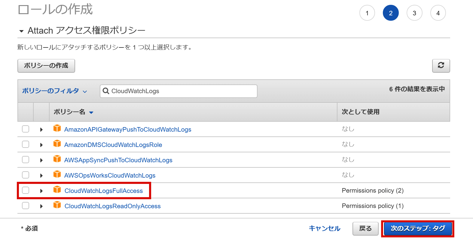 Attachアクセス権限ポリシーにて「CloudWatchLogsFullAccess」のポリシーを選択し、「次のステップ:タグ」をクリックします。タグの設定画面では任意のタグを入力し、「次のステップ:確認」をクリックし、確認画面でロール名などを設定します。問題なければ「ロールの作成」をクリックしロールを作成します。