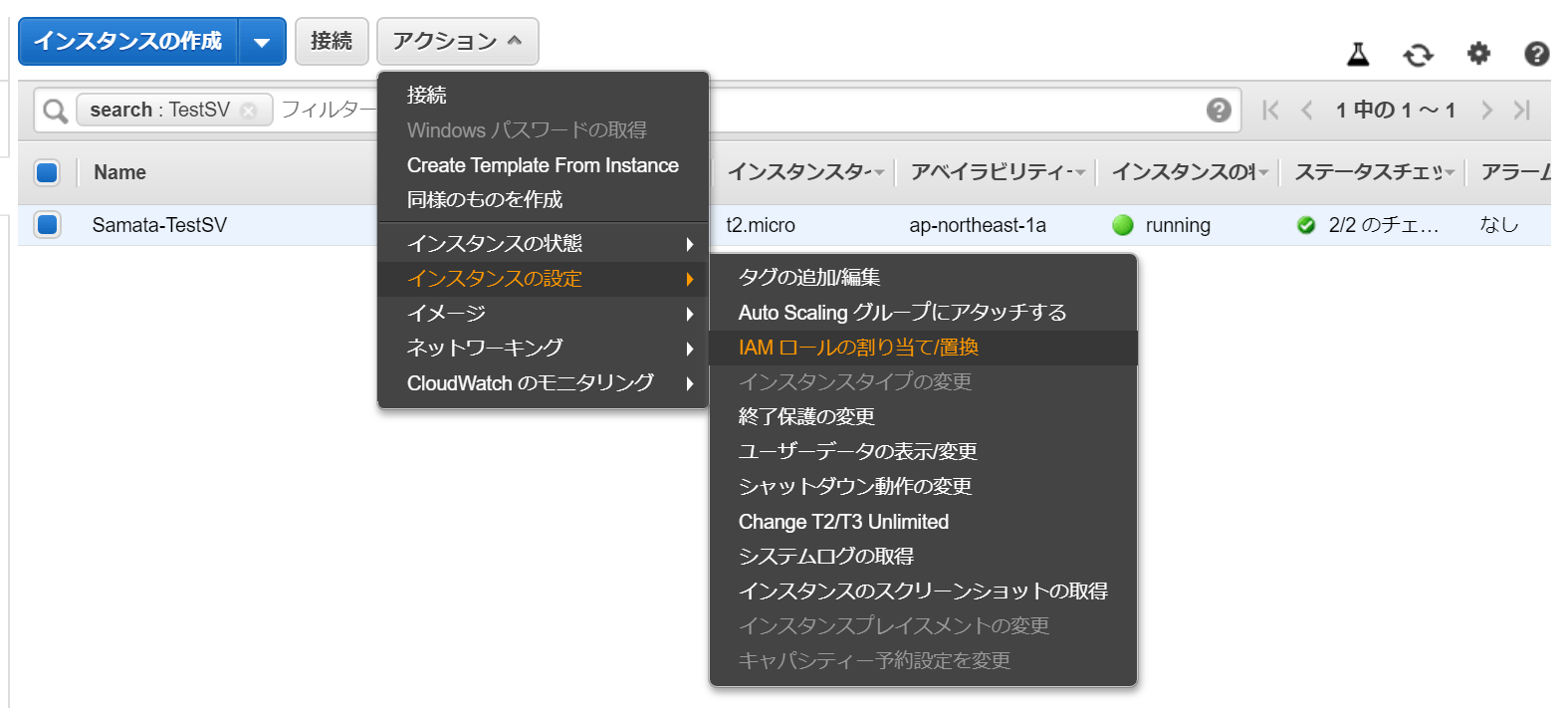 作成後は対象のインスタンスを選択し、「アクション」→「インスタンスの設定」→「IAMロールの割り当て/置換」に進み、作成したIAMロールをEC2にアタッチしてください。