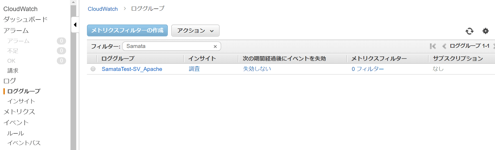 今回はSamata-TestSV内のApacheというアプリケーションを一つのロググループとし、その中にApacheログを集約する形式としていますが、環境によって管理しやすい方法を選んでみてください。