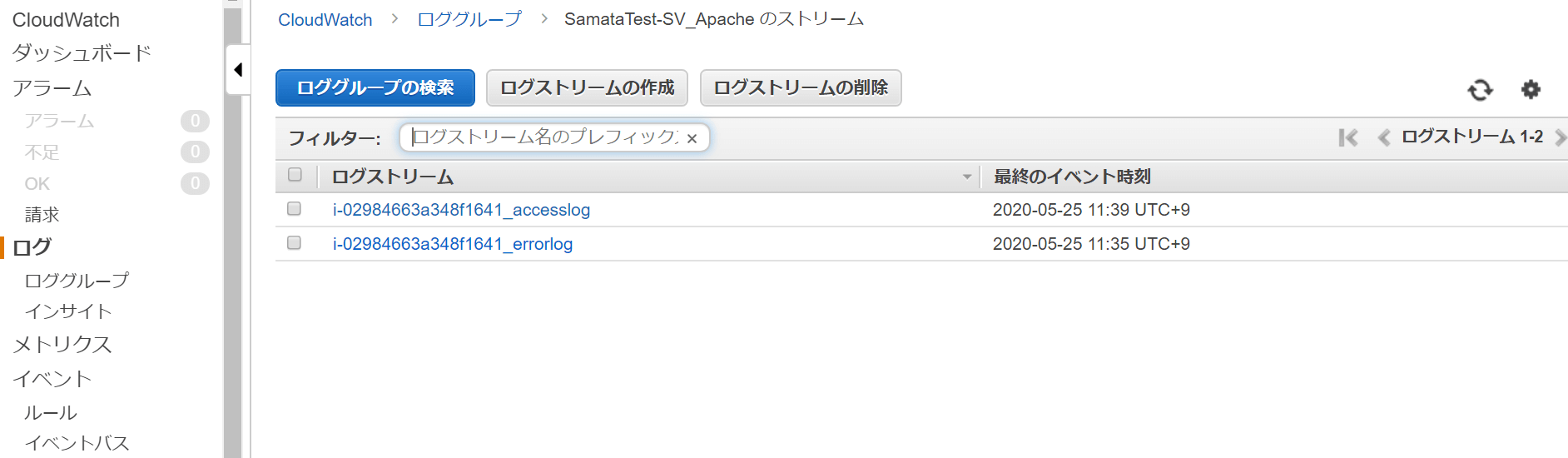 次にロググループの中身です。設定したログストリーム名でアクセスログ、エラーログのログストームが作成されています。