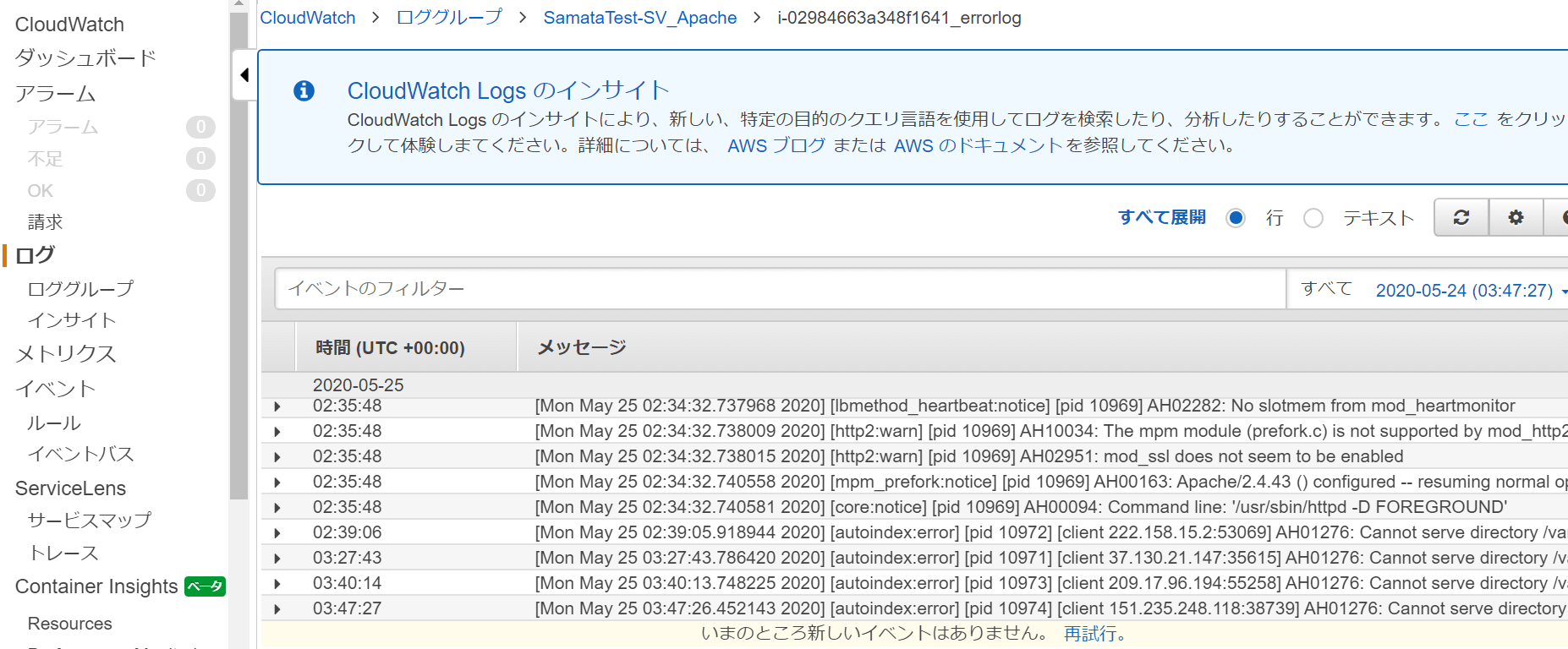 プロセスを開始したら、実際にCloudWatch Logsへログが出力されているか確認してみましょう。注意しておきたいのは、当然ながら実際のログが出力されていないと確認することができません。今回はApache(webアプリケーション)のログのため、以下を試行しておきましょう。