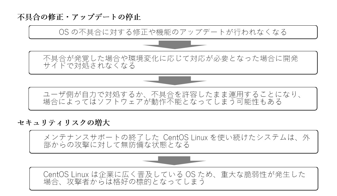 では、サポート終了後のCentOS Linuxを使い続けると、どのようなリスクがあるでしょうか。